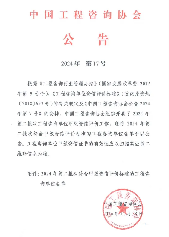 廣咨國際再次通過工程咨詢甲級資信評價