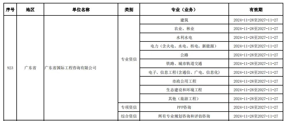 日前,中國工程咨詢協(xié)會公布了獲得2024年第二批次符合甲級資信評價標準的工程咨詢單位名單,廣咨國際集團全資子公司廣東省國際工程咨詢有限公司再創(chuàng)佳績,成功延續(xù)了甲級綜合資信、甲級專項資信和原有8個甲級專業(yè)資信,還新增獲得了電力(含火電、水電、核電、新能源)和其他(旅游工程)2個甲級專業(yè)資信,甲級專業(yè)資信數(shù)量達到10個。